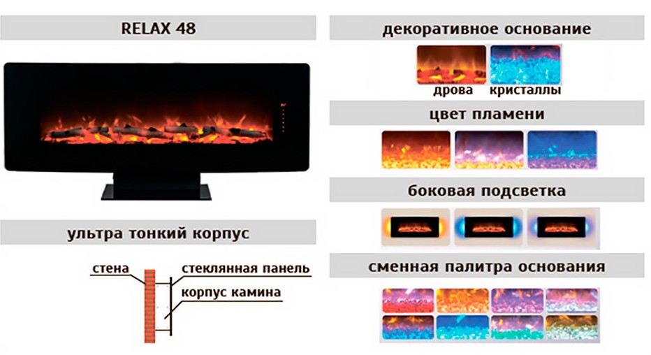 Настенный, не повредит стену, изогнутый дизайн панорамного стекла. Покажите свой отличительный выбор и вкус !; Долговечные светодиодные энергосберегающие технологии; Очень тихий вентилятор и сенсорная панель, как у смартфона, электрический камин InterFlame RELAX 48GLX очень продвинутый, модный, красивый и удобный