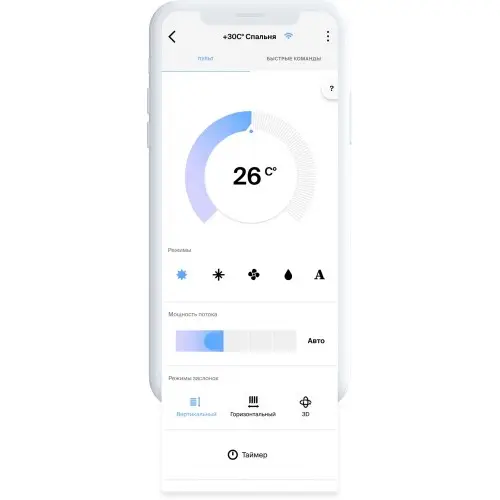 - Управление режимом работы кондиционера (охлаждение, обогрев, вентиляция, осушение, авто-режим)